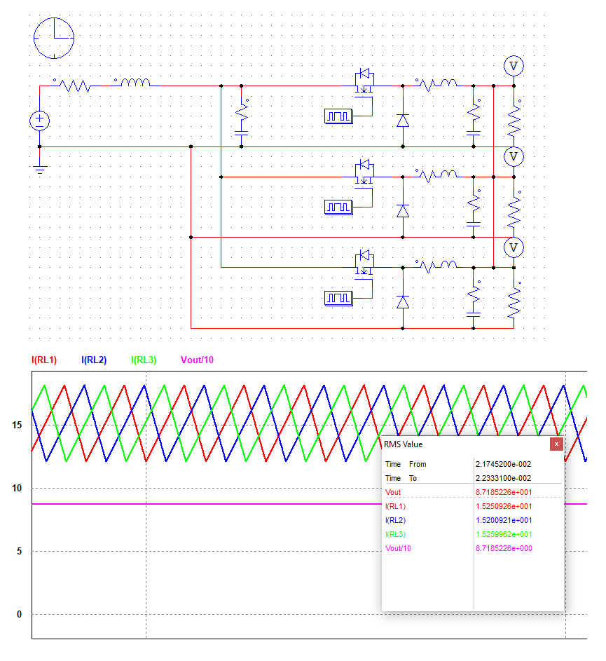 Her bir yeni tasarıma başlarken ilk düsturum simülasyon yapmaktır. Bu konuda daha önce de bahsettiğim PSIM simülasyon programını aktif kullanmakta ve önermekteyim. Aşağıda, yukarıda blok diyagramı görülen yapının simülasyon ve sonucu görülebilir.Bu simülasyon sonucunda, giriş kapasite toplam RMS ripple değeri 4.5A, çıkış RMS ripple akım değeri ise 100mA civarında olmuştur. Eğer interleaved yerine tek bir kat ile sürmüş olsaydık giriş kapasitesinin toplam RMS ripple değeri 22.5A, çıkış kapasitesinin RMS ripple değeri ise 1.75A olmaktadır. Aradaki bu 5 katlık fark interleaved çalışmanın ne denli önemli olduğunu göstermektedir. Yine simülasyon sonuçlarından tek bir katta her bir mosfet’ten 12.5Arms, diyottan ise 5.5A ortalama akım akacağı görülmüştür.