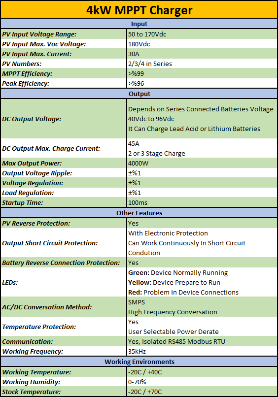 Bunların ışığında tasarladığım proje, minimum 2 ya da 4 güneş panelinden alınacak olan enerjiyi 24/36/48/60/72V gerilime sahip, seri olarak bağlanmış aküleri (lityum aküler de dahil) şarj etmek üzerine kurgulanmıştır. Seri bağlanacak akü sayısına ve PV girişine bağlı olarak projenin çıkış gücü, sürekli biçimde 4kW verecek şekilde limitlenmiştir. Aşağıda tasarladığım projeye dair tüm isterler görünebilir.
