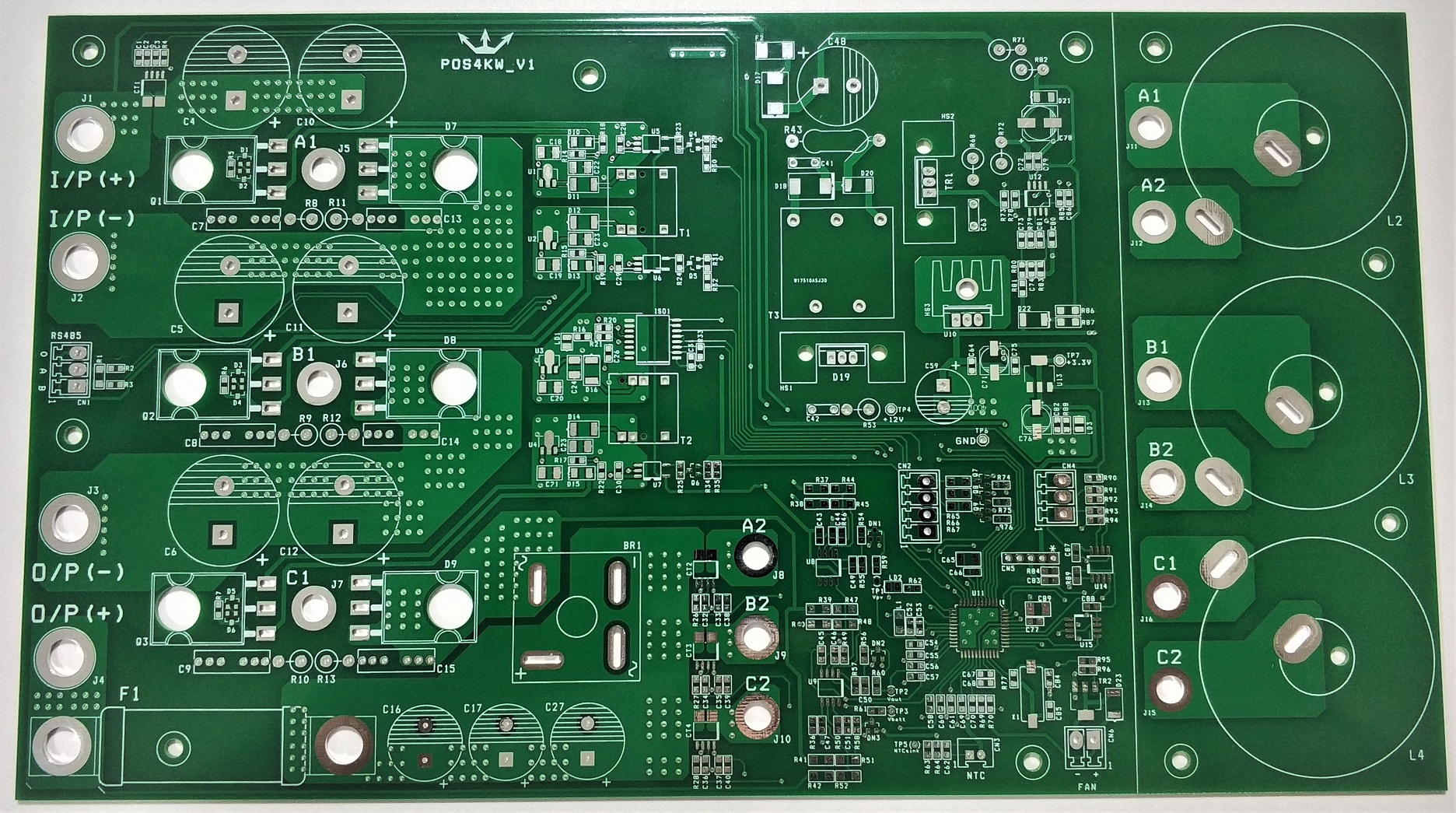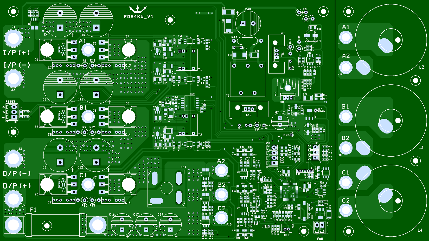 Projeyi oluştururken en önemli kriterlerimden biri tasarımın tek kart üzerinde bitirilmesi olmuştu. Daha önce, yüksek güçlü bir çok IGBT güç modülü ile çalışsam da bu modüller, teknolojileri gereği, yüksek frekanslarda çalışmaya uygun olmadıklarından, bu tasarım içerisinde yüksek hızlı discrete mosfet’leri kullanmayı tercih ettim. 35kHz gibi bir hızın da yaptığım çalışmalarda uygunluğunu gördüm. Tasarıma uygun akım sensörleri, kapasiteler, bobinler seçerek tasarımı aşağıdaki gibi bitirdim.PCB tasarımı, ayrıca cihazın elektriksel sinyallerini de taşıyan ana unsur olduğundan, güç elektroniğinin altın kuralları PCB’ye dikkatle işlenmiştir. Bunun yanında dijital ile analog bölüm ayrımı, cihazın çalışmasını etkileyecek bir çok unsur da dikkate alınmıştır. Kart boyutu 18x32cm olarak ortaya çıkarılmıştır. Maliyetlerin daha uygun olması nedeniyle PCB’nin 1oz bakır ve 1.6mm kalınlığında standart üretim olması kararı aldım.