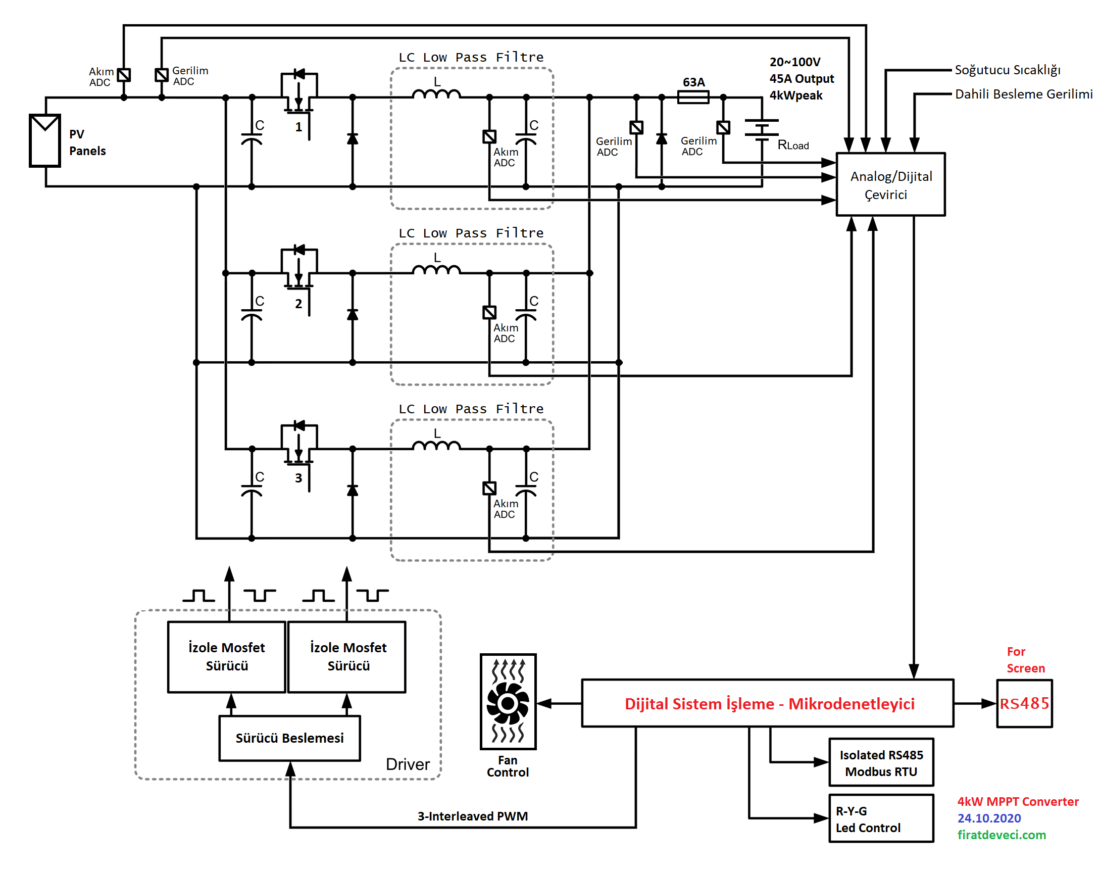 Yukarıdaki özelliklere bakıldığında izolasyon gerekmemesinden dolayı topolojinin gerilimi düşürücü yönde buck converter seçilmesi uygun görülmüştür. Bu topolojik seçim ile birlikte bir diğer soru; DC/DC dönüştürücünün tek katla mı yoksa paralelleyerek mi güç katının yapılacağıdır. Daha önce buradaki yazımda belirttiğim üzere hem kapasitör ripple RMS akım değerlerini küçülttüğü, hem boyut hem de maliyeti azalttığı için 3’lü interleaved buck converter topolojisi seçilmiştir. Tek katla da bu dönüştürücüyü yapmak mümkünse de gerek seçilecek olan yüksek ripple akımlı kapasiteler (genel itibari ile çıkış akımının yarısı olan 22.5A RMS gibi görülebilir) gerek ise kullanılacak bobin hem maliyetli olacaktır hem de üzerlerinden akacak yüksek akımdan dolayı ısıl kaybının çok olacağı anlamına gelir. Bu da verim ve soğutma konusunda sıkıntılara yol açabilir. Tüm bu dediklerimiz ışığında ortaya çıkan elektriksel blok diyagram aşağıdaki gibi görülebilir. Daha dikkatli bakmak için resim üzerine basarak büyütmeniz gerekmektedir.Güç bloğunun tüm elektriksel kontrolü, sıcaklık, hata tespitleri, MPPT ve bir çok özelliğin yönetilmesi dijital olarak mikrodenetleyici ile yapılmıştır.