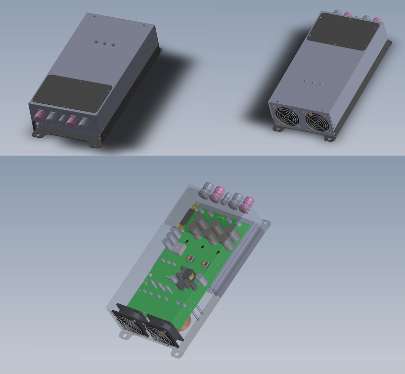 Güç elektroniği ile mekanik tasarımın birbirinden ayrılamaz siyam ikizi olduğunu unutmayarak; tasarladığım bu projeyi salt PCB üzerinde kullanabilecek olsam da, projenin bir kutuyu hak ettiğini düşündüm. Dolayısı ile yıllar içinde edindiğim mekanik tecrübemi bu proje içine yansıtarak ve arkadaşlarımın da desteğini ile (her ne elektromekanik bilgim olsa da üretimin inceliklerini bilenler onlar) aşağıdaki çizime ulaştım.Mekanik tasarıma bakıldığında bir soğutucu, onun üzerine yerleştirilmiş bir elektronik kart ve 4 parça basit mekanik montaj parçaları görülebilir. Türkiye’de soğutucu ve mekanik parçaları üreten bir çok firmaya ulaştım ve beklediğimden uygun fiyatlara bu kutuyu ürettirebildim.