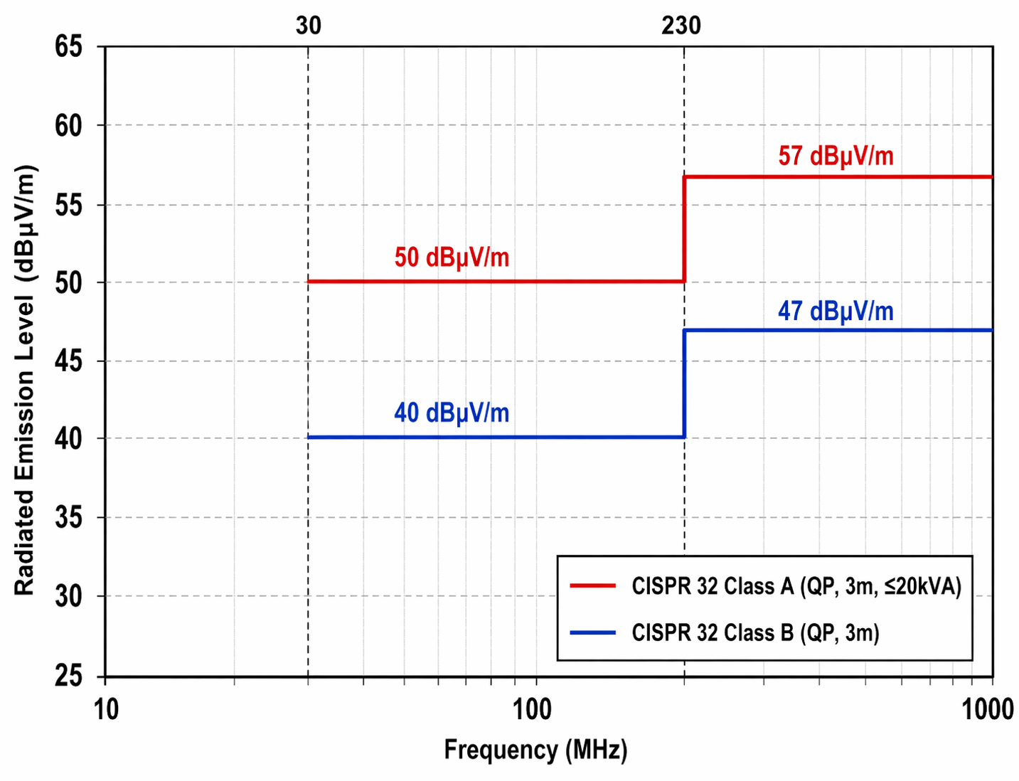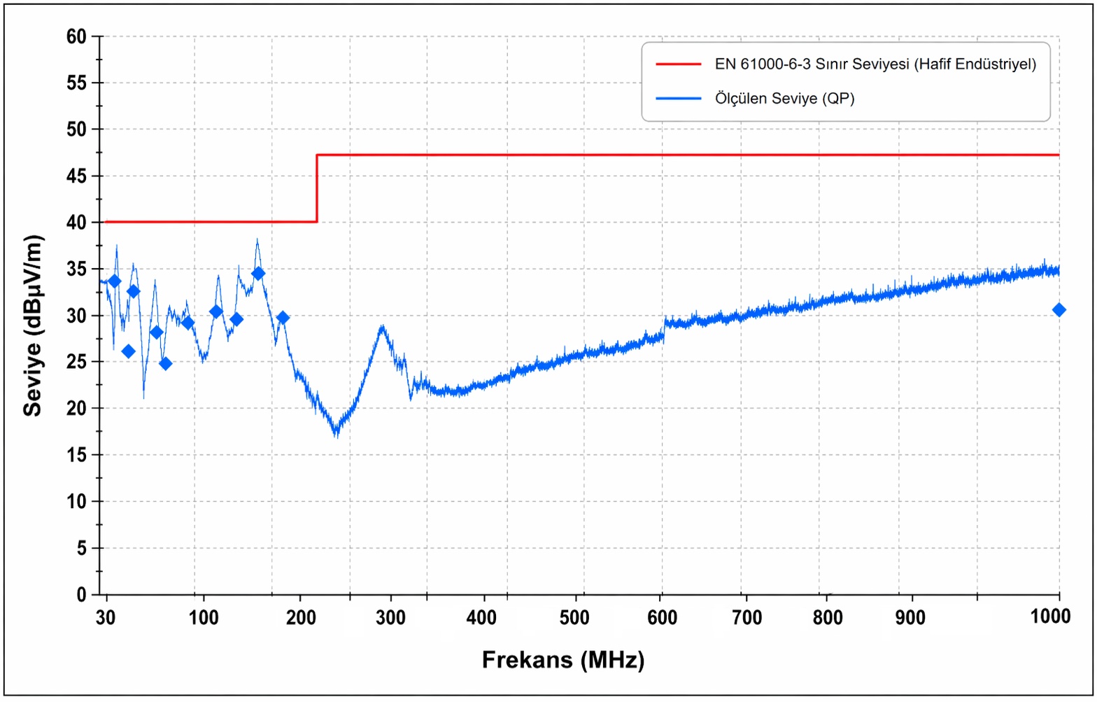 Endüstride aşağıda görebileceğiniz üzere Class A ve Class B olmak üzere iki adet RE limiti çok sık kullanılmaktadır. Cihaz gücüne göre limitler Class A seviyesine çıkarılabilir. Test sonucunda ölçüm sinyalinin limitler altında olması beklenir.