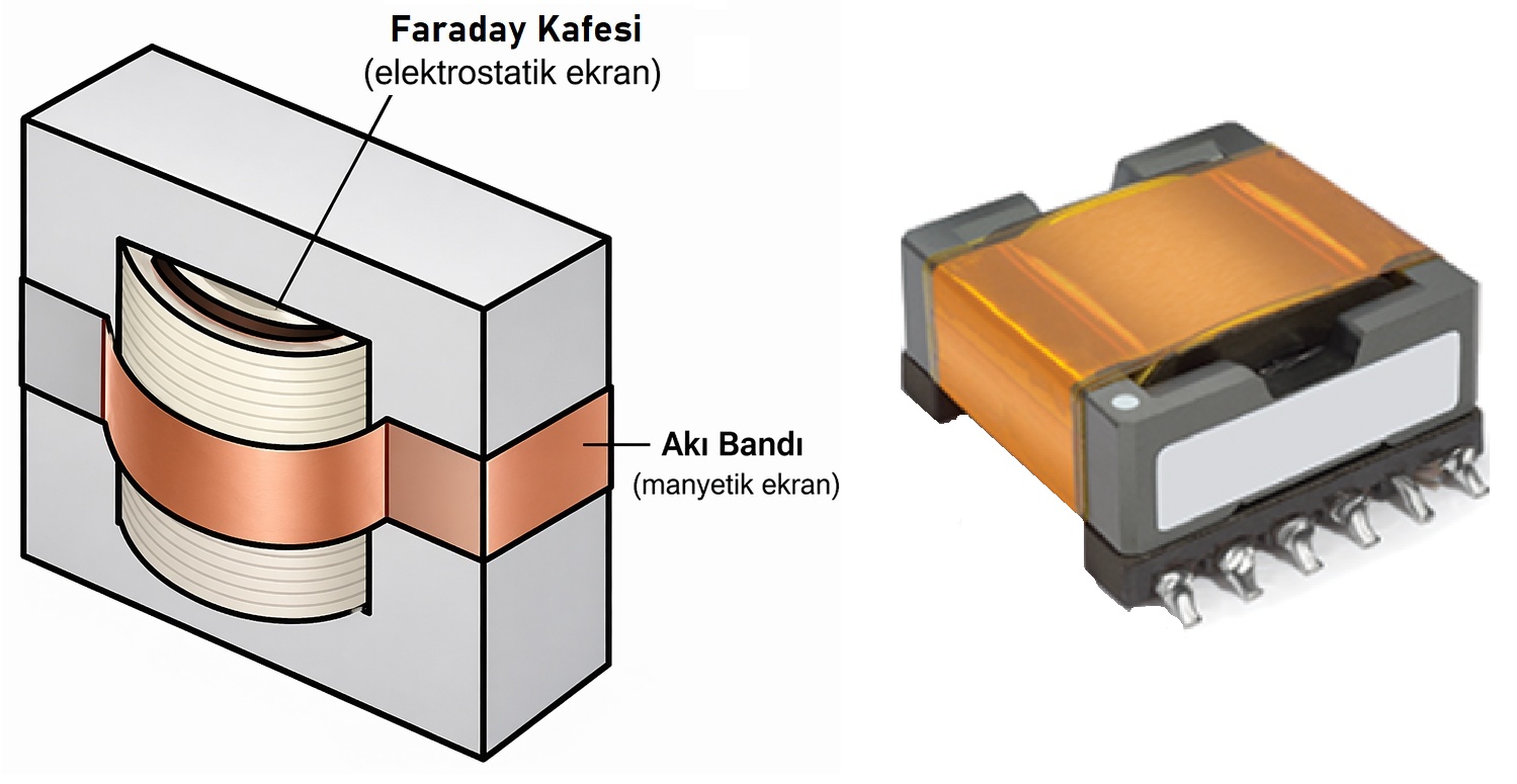 Özellikle Flyback, LLC trafoları ya da bobinler gibi manyetik elemanlarda bobin değerinin değişmemesi için hava boşluğu kullanırız. Yalnız bu hava boşluklarından daha önce burada bahsettiğimiz gibi manyetik akılar dışarı doğru akmaya başlar. Özellikle yüksek frekans uygulamalarında bu manyetik alan çevre ile etkileşerek elektromanyetik sinyal yayılımına neden olabilir. Bunun önüne geçmek için hava boşluğunun etrafına bir akı bandı sarılabilir. Ayrıca primer ve sekonder sargılarının oluşturacağı kaçak kapasitansın etkisini de azaltmak için shield sargısı sarılıp gerekirse devre toprağına verilebilir.