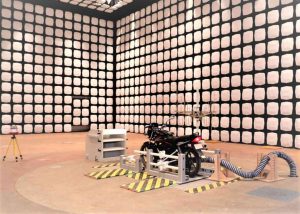 RE Test alanı, test alanları içerisinde en farklı olanlarındandır. Anechoic chamber olarak adlandırılan bu odalar, EMC/RF testlerinde kullanılan, dış dünyadan elektromanyetik olarak izole edilmiş ve yansımaları minimuma indirilmiş özel bir test odasıdır. Buradaki asıl amaç içeride oluşan elektromanyetik dalgaların duvarlara çarparak geri dönmesini engellemek böylelikle cihazın oluşturduğu “saf” gürültüyü ölçebilmektir.