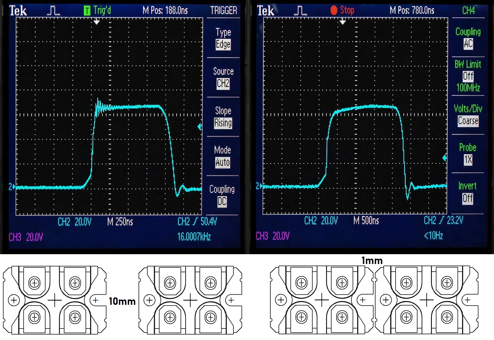 Yapmış olduğum bir uygulamada 10mm ve 1mm aralıkla yerleştirilmiş iki adet mosfetin etkisi görülebilmektedir. Mosfetleri birbirine yaklaştırmanın etkisi sağdaki sinyalde kendini göstermiştir. Anahtarlama frekansı 16kHz olsa da, birbirinden uzak mosfetlerin yüksek frekans bileşenleri çok daha yüksek olmakta ve RE testinde sıkıntılar yaşatabilmektedir.