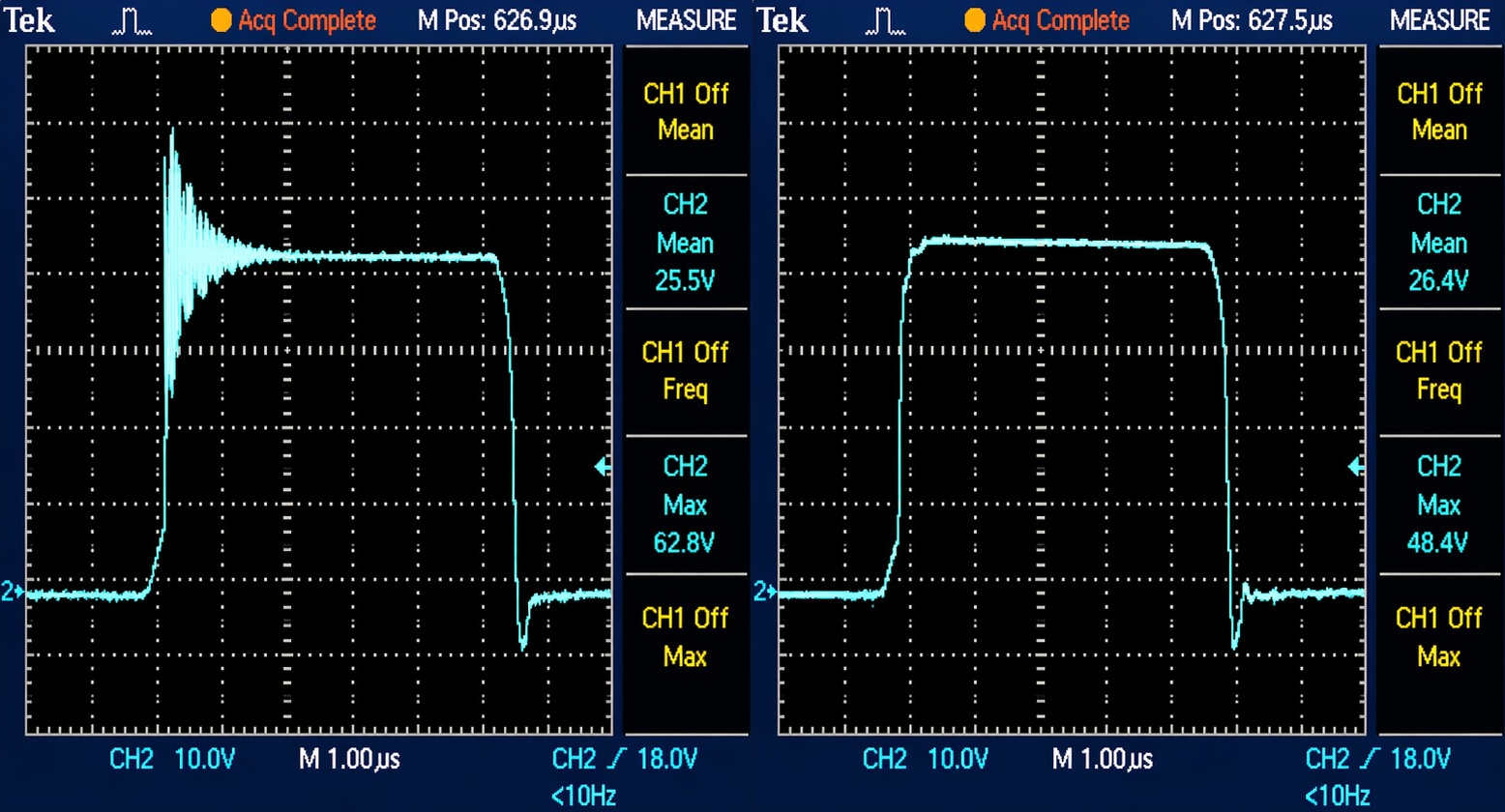 Snubber kullanmak da ayrıca RE konusunda bize yardımcı olmaktadır. Solda snubber kullanılmamış devrenin anahtarlama yapısı, sağda ise küçük güçte bir snubber devre kullanılmış devrenin anahtarlama sinyali gözükmektedir. Snubber her ne kadar ısıl kayba neden olsa da hem CE hem de RE testi için bizlere en iyi sonucu kolay yoldan sunabilmektedir.