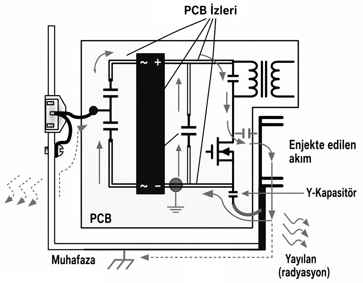 Şematikte olmayan ama gerçekte var olan şeyler; MOSFET–heatsink arası kapasitans, trafo sarımları arası kapasitans, PCB katmanları arası coupling gibi etmenler istenmeyen kapasitanslar oluşur. Yüksek frekans altında bu kapasitelerden akımlar akmaya başlar ve bu yüksek frekansta akımın “kestirme yollar” bulmasına neden olur. Bu akımlar çoğu zaman kasa ya da kutu üzerinden üzerinden kapanır ve sonuç kutu üzerinden bir radyasyon yayılımı anlamına gelir. Aynı şekilde oluşan parazitik endüktanslar ise birer anten gibi davranarak benzer etkiyi gösterirler.